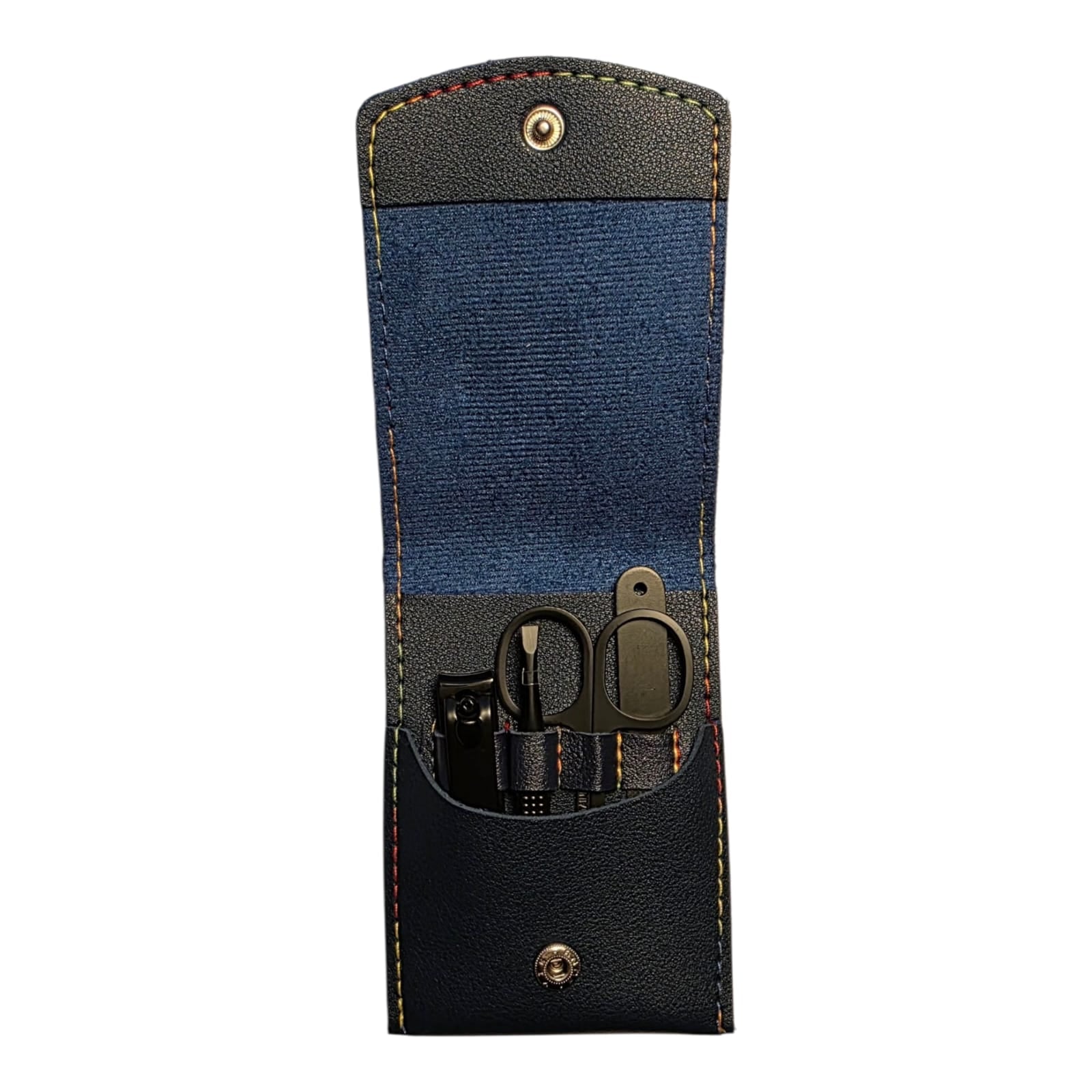 Leather navy blue pouch with a neat travel manicure set containing 4 pieces in cool black steel: nail clippers + nail file + eyebrow tweezers + grooming scissors. Rustproof & durable packed in a protective leather case.