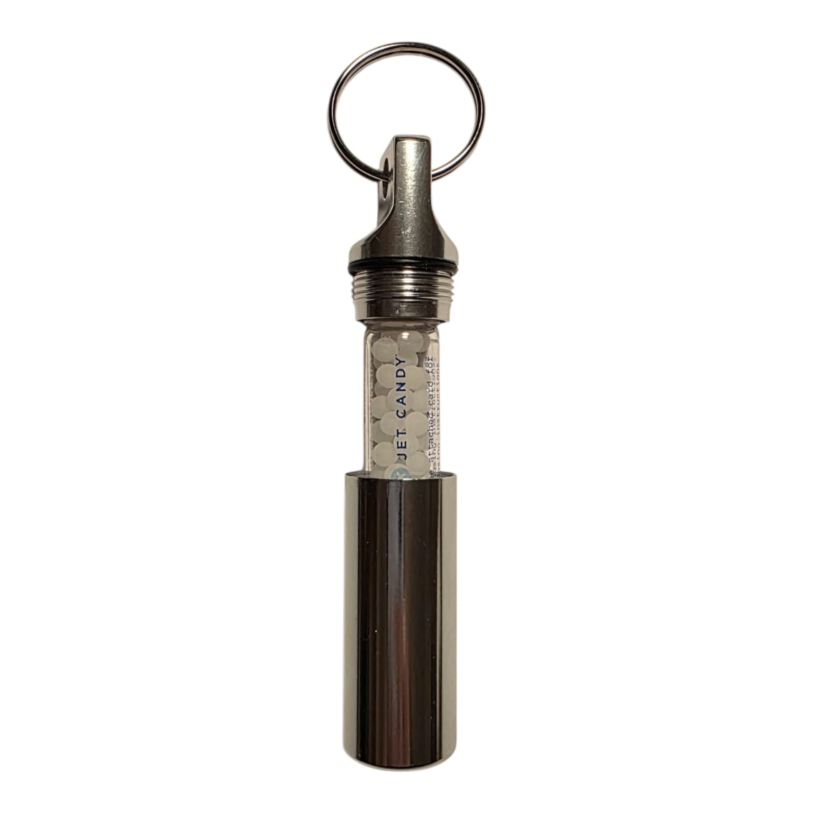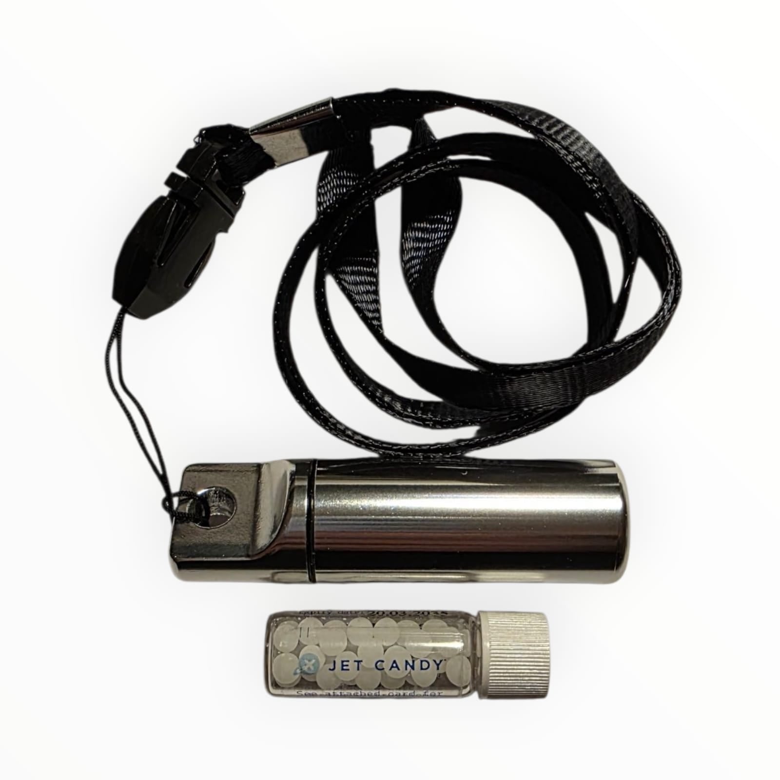 Combination holder and Jet Candy MINI product. Perfectly created to include the Mini Jet Candy Plane Remedy. The MINI dispenser fits neatly into the holder, and is practical to wear around your neck with your own lanyard. This way it will always be handy and you won't forget where your jet lag remedy is, when you need it on the go. Hang it on your key ring or hand back if you prefer. Jet Candy; Keep it Handy!  ( doesn't come with a lanyard, but we are working on one! )